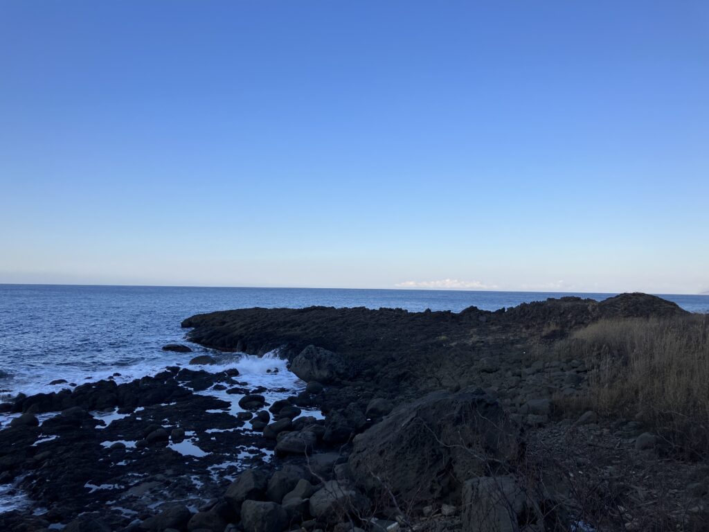 丘陵と海岸の間の狭い平地に道が続いている。