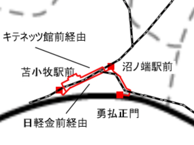 平日は11往復、休日も運行している。キテネッツ館前を通る系統がメインで、日軽金前を経由するものが1.5往復ある。日軽金前を通る道南バス唯一の路線である。このほか苫小牧駅前からウトナイ方面を経由して勇払正門に至る103系統が1日2便ある。ここでは1日1.5往復の日軽金前を通るルートを掲載する。道南バスのサイトによると、高校生のための「学生専用便」の一部が勇払正門まで運行しているようだ。