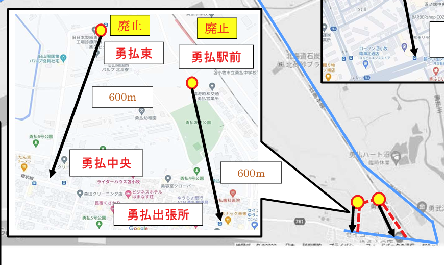 苫小牧市のサイトによると、2024年4月に勇払線の経路変更が行われ、「勇払東」および「勇払駅前」停留所が廃止になったようだ。