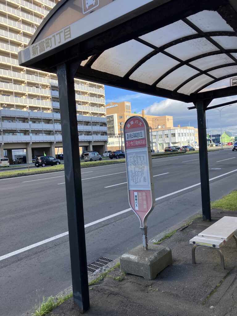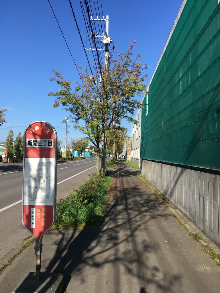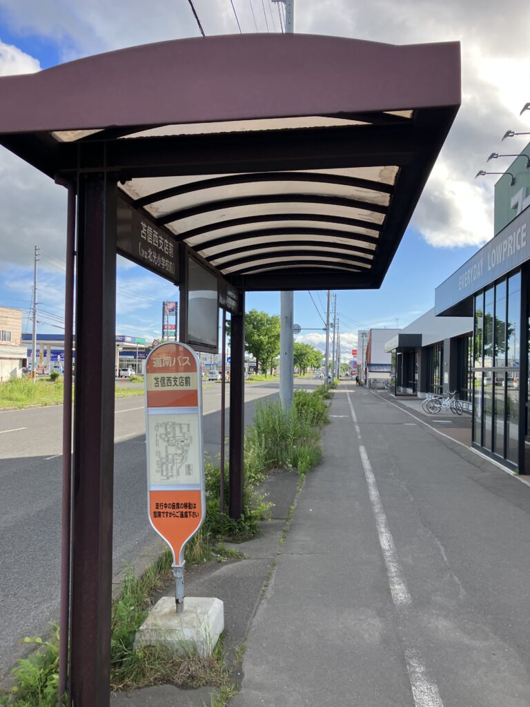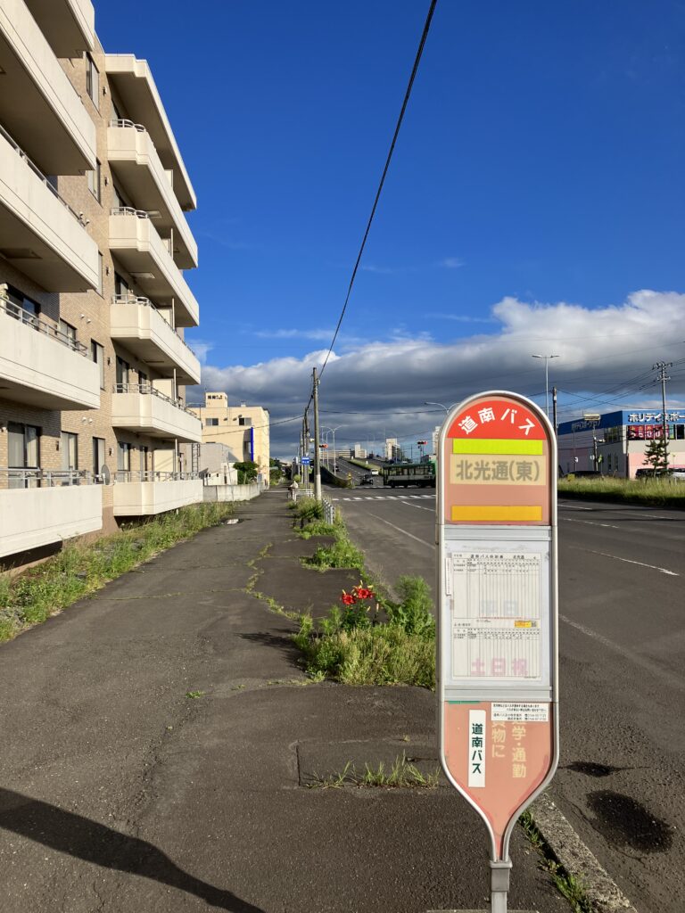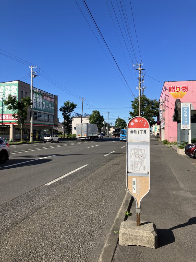 勇払中央近くのあるバス停。「(株)札幌標板製作所前」とある。 (08/21/2025)
