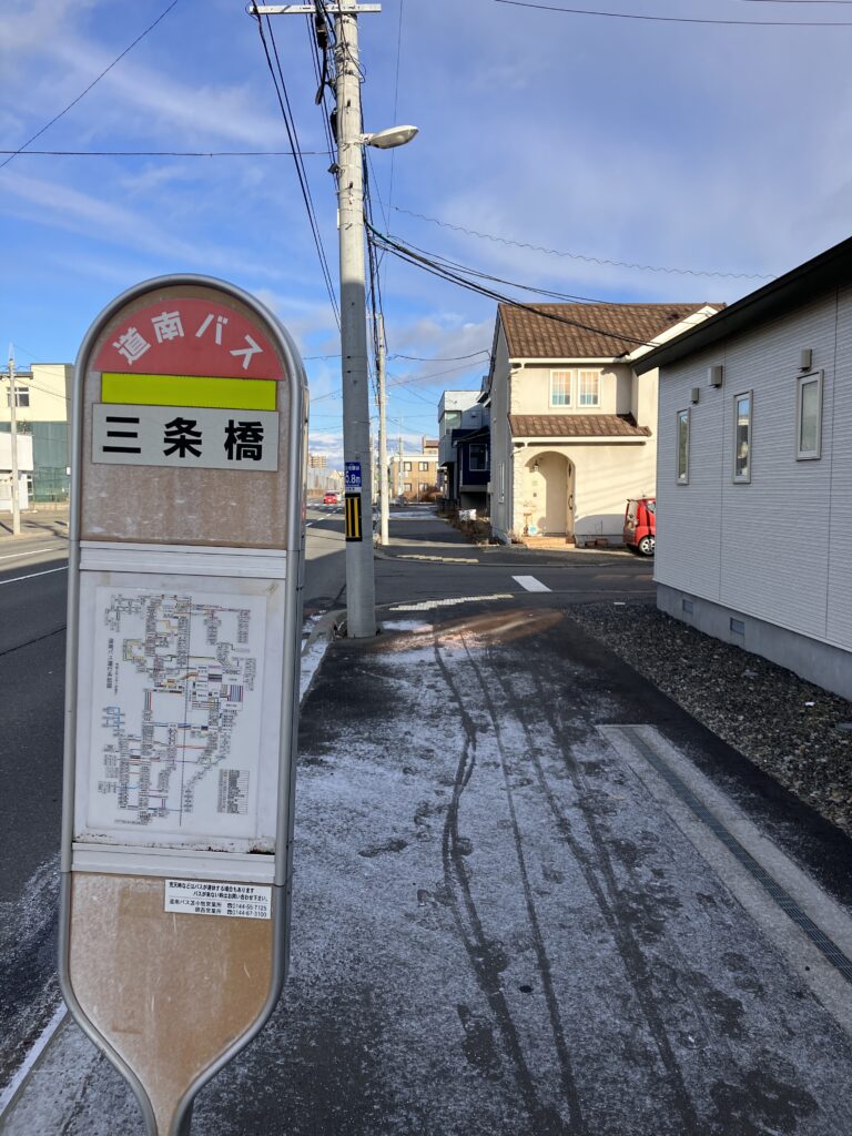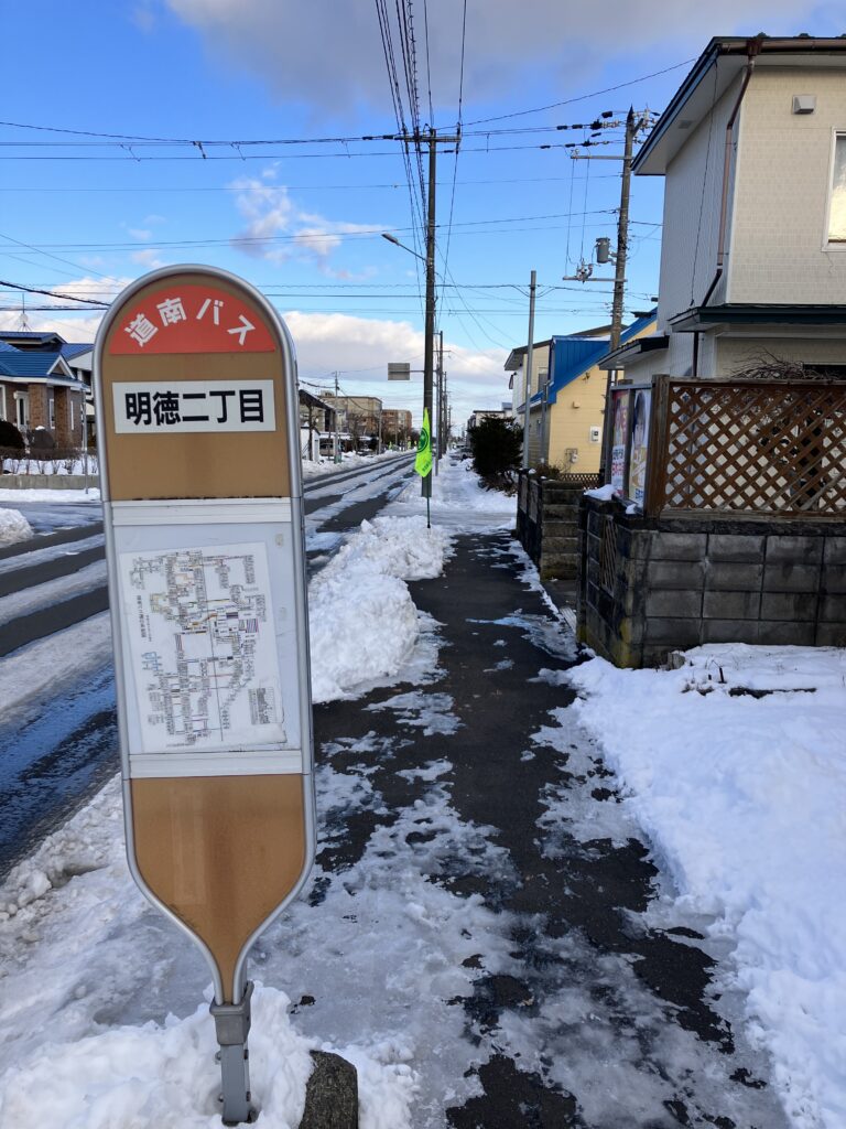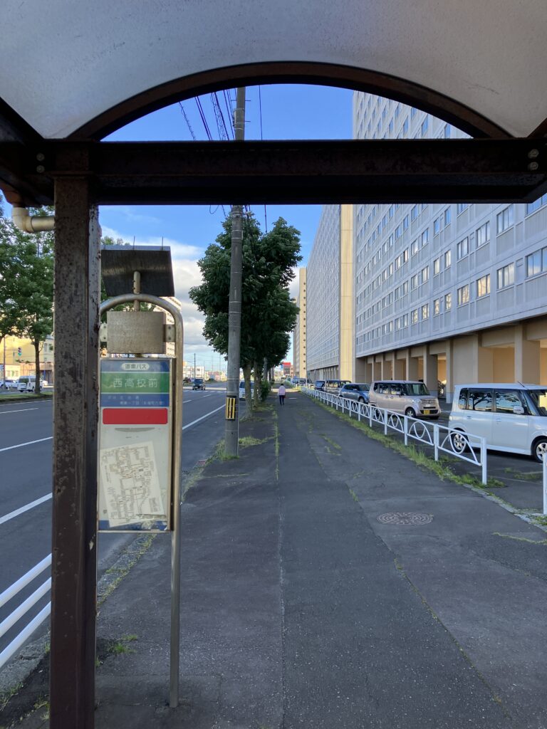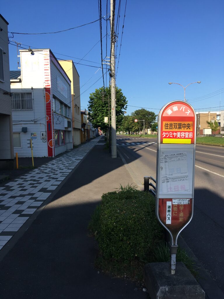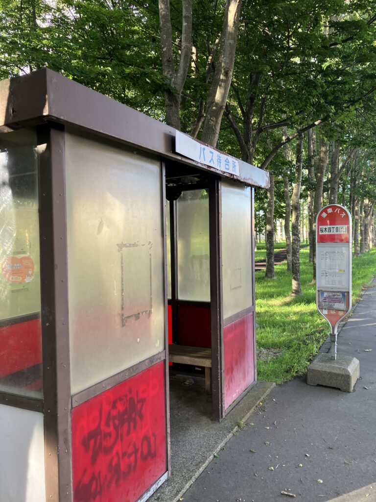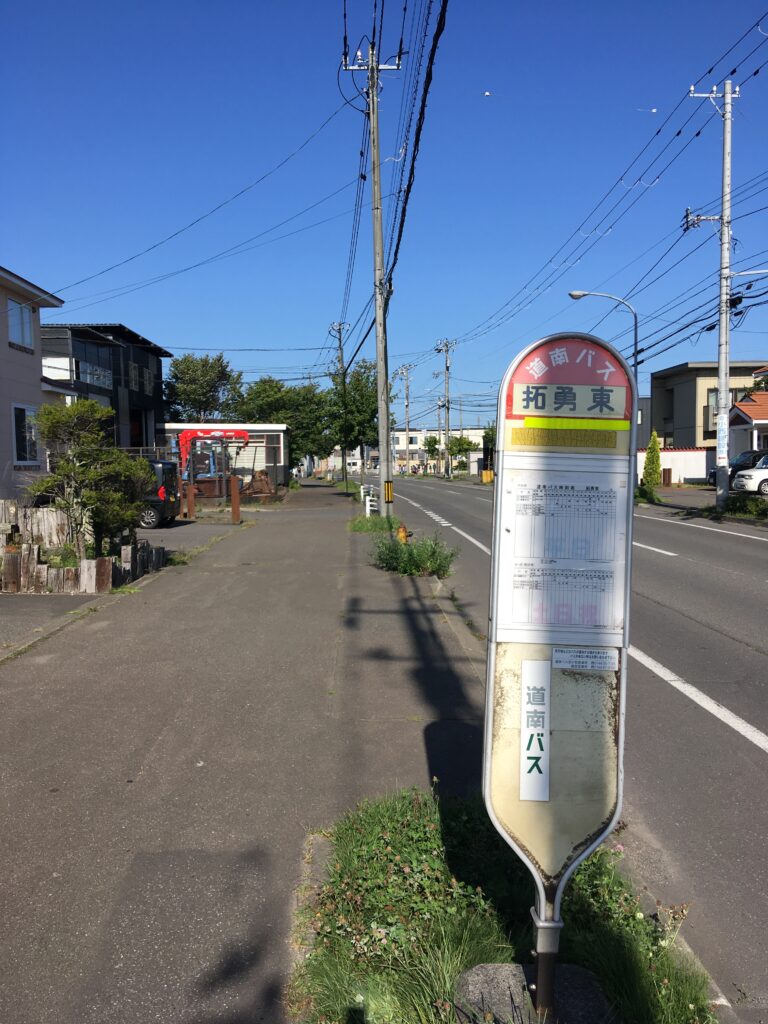 勇払中央近くのあるバス停。「(株)札幌標板製作所前」とある。 (08/21/2025)