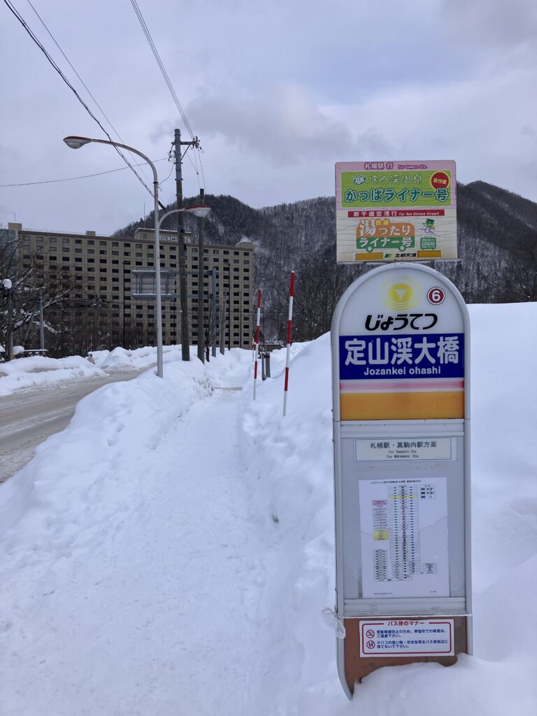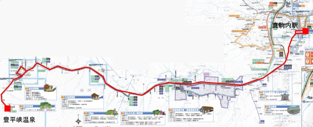 地下鉄真駒内駅から国道230号に出て、ひたすら西進して定山渓、さらには豊平峡温泉に至る。外国人観光客で混雑する路線。