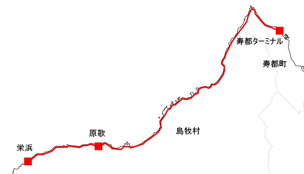 寿都ターミナルを出て島牧村に入り、各漁村をまわりながら村の南西端・栄浜に至る。ほぼ全線が海沿い、トンネル区間も多い。全長約40 km。一日3往復。栄浜に行く便は1日1便、栄浜を出る便は2便。2025年から土日祝日の運行は終了、島牧村が引き継いでマイクロバスを走らせている。近いうちにニセコバスが全面撤退する可能性も考えられる。ちなみに栄浜の先には瀬棚町に入るまで人家はほとんどない。