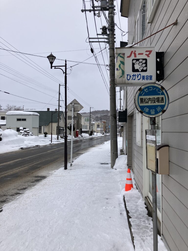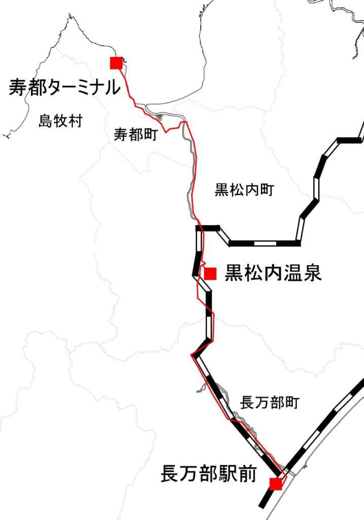寿都ターミナルを出て湯別地区を出たところで海沿いを離れ、朱太川に沿って黒松内町内を南下する。黒松内駅、黒松内温泉を経たのち、JR函館本線(いわゆる山線)に沿って南下を続け、長万部駅に至る。寿都-黒松内間は旧寿都鉄道の代替路線とも言えるし、国鉄岩内線なき現在では、JRに接続できる貴重なルートでもある。また、一日4.5往復しか列車のない黒松内-長万部間では、その不便さを補完しているようにも見える。ところが実際に走っているのは、寿都-黒松内間が1日2便、寿都-長万部間は1日1便である。前者は自分でも乗車し、運行中のバスも何度か見かけたが、ほとんど乗客は見られなかった。