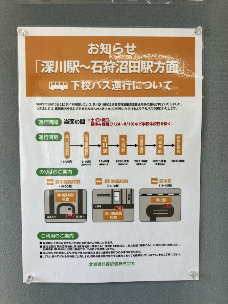 もともと8往復の設定であるが、2025年時点で1.5往復が減便されている。運行系統は複雑で、基本は上図の緑色の線で示されているが、石狩沼田駅を通らないもの、駅の北側一帯を回るもの(1日1便のみ、上図の赤線)、さらに2023年3月の留萌本線「石狩沼田-留萌」間の廃止に伴って開設された旧真布駅経由のルート(1日1便のみ、上図の青線)がある。早朝の1便は恵比島から真布を経て「石狩沼田駅(新設)」まで運行している(上図の茶色線)。ここでは駅北一帯を回る路線を中心に紹介する。