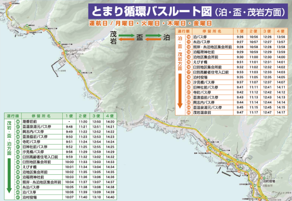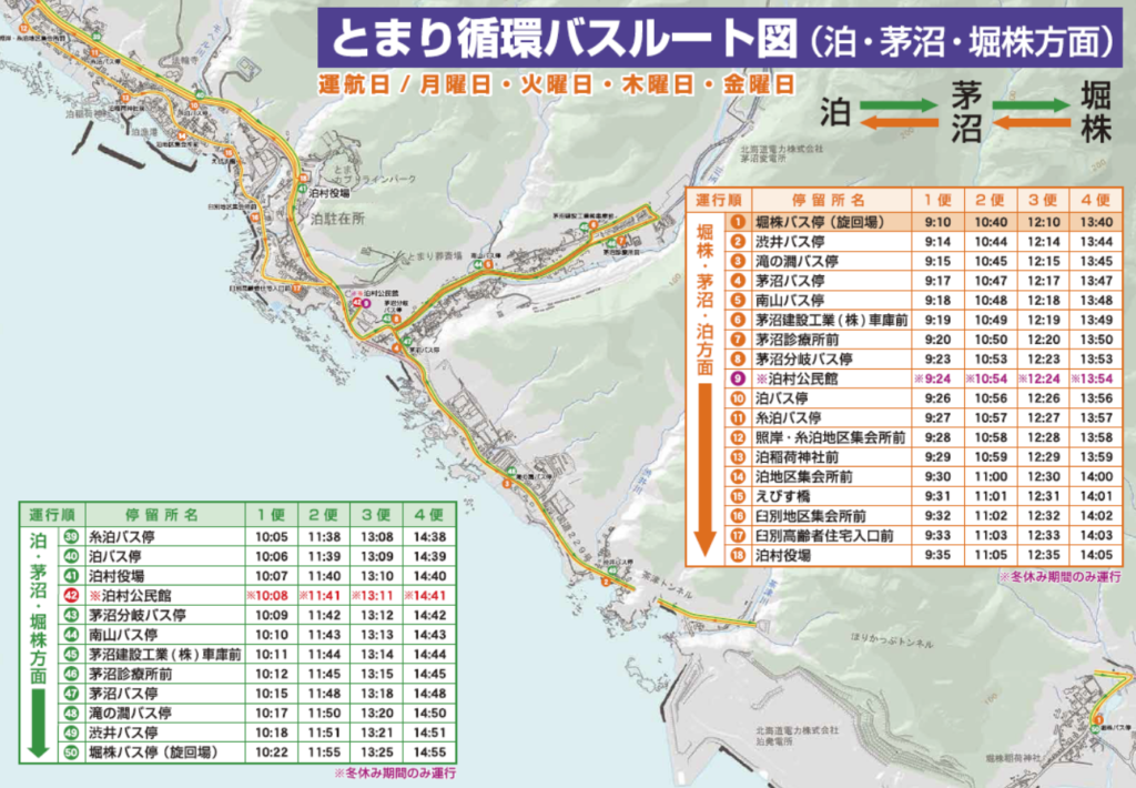 茂岩温泉前⇔泊バス停(泊村役場)、堀株バス停⇔糸泊バス停(泊村役場)